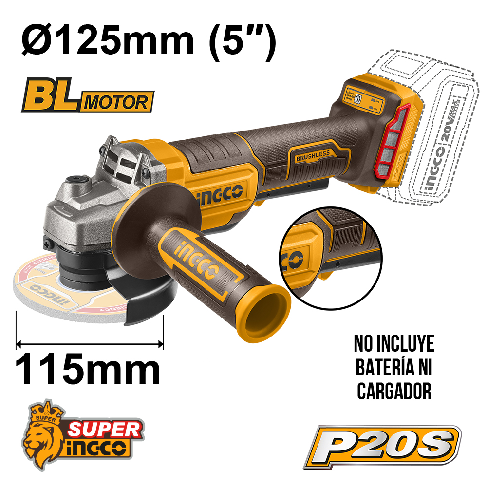 CAGLI211156 – AMOLADORA 20V 4 1/2″ BRUSHLESS – GATILLO PALETA – SIN BAT. NI CARGADOR